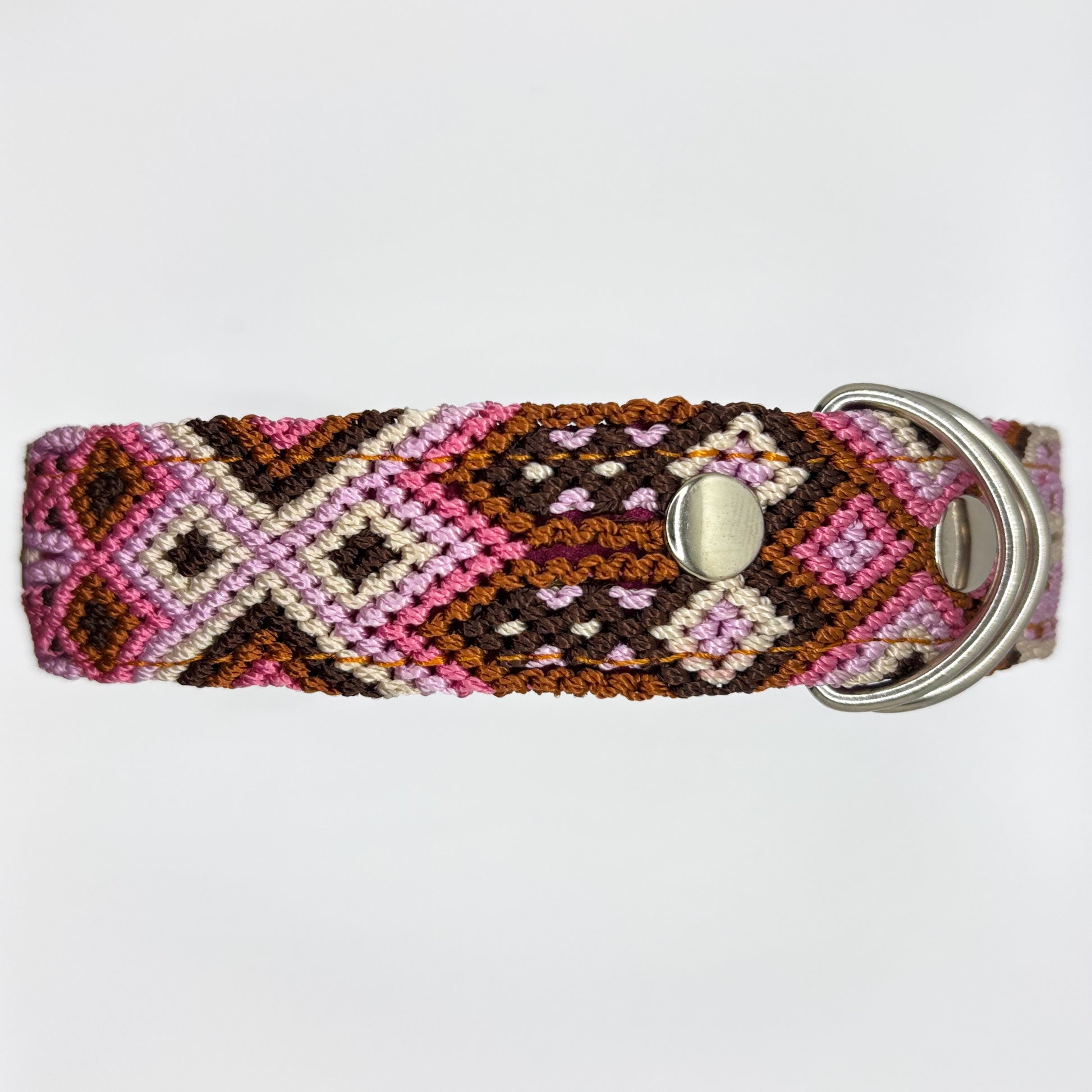 A perfect blend of warmth and charm, the Canela Rosa collar pairs rosy pinks and soft creams with rich cinnamon browns and deep burgundy details. Set on vibrant magenta leather, this 50cm Large collar is both playful and refined, designed for dogs who carry sweetness and strength in equal measure.