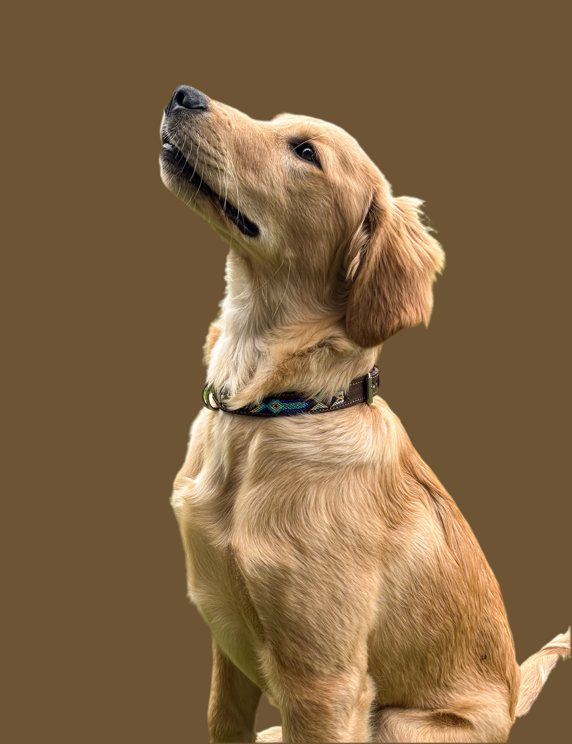Bold, elegant and full of depth, the Noche Azul collar combines deep navy, turquoise, beige and black in a striking diamond weave. At 45cm this Large collar is perfect for dogs who carry the quiet strength and mystery of the night sky.